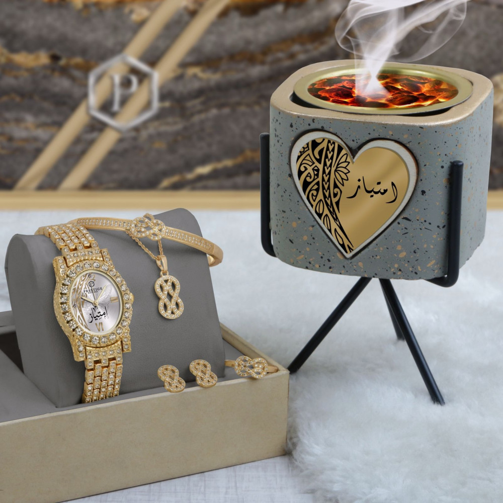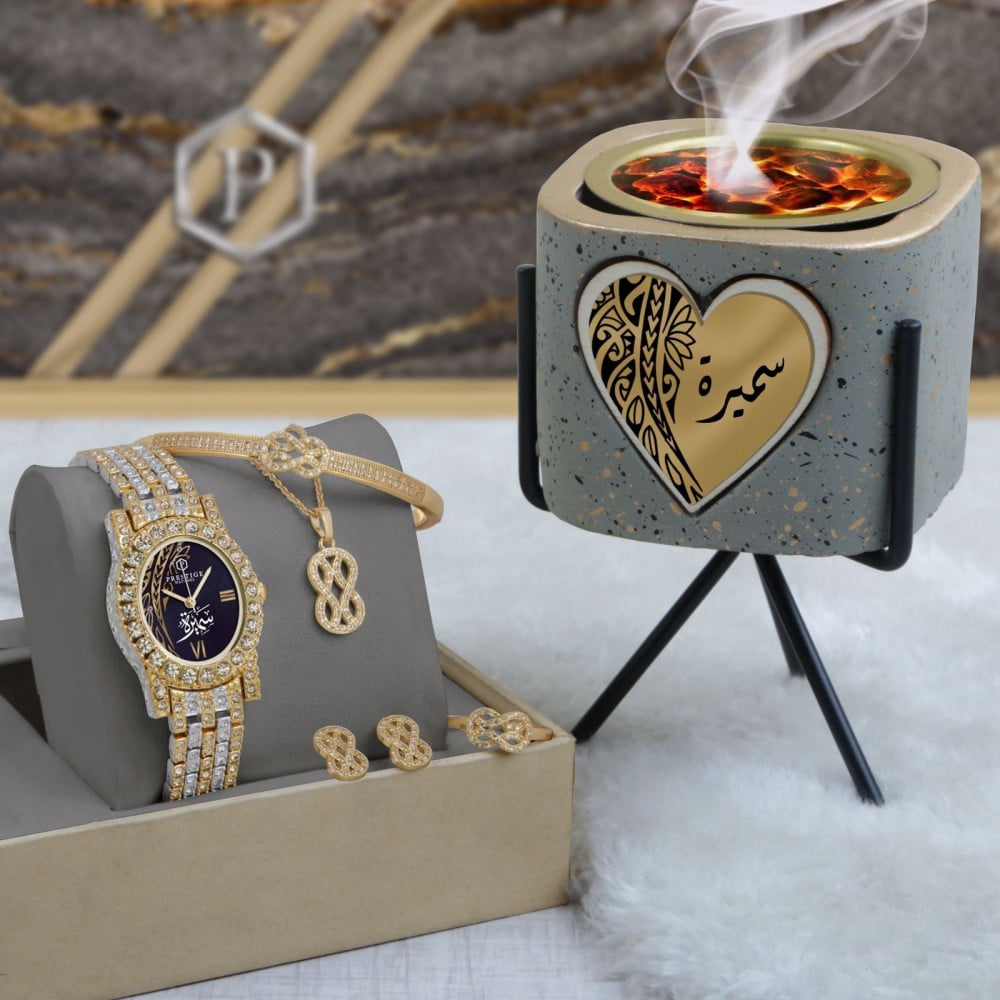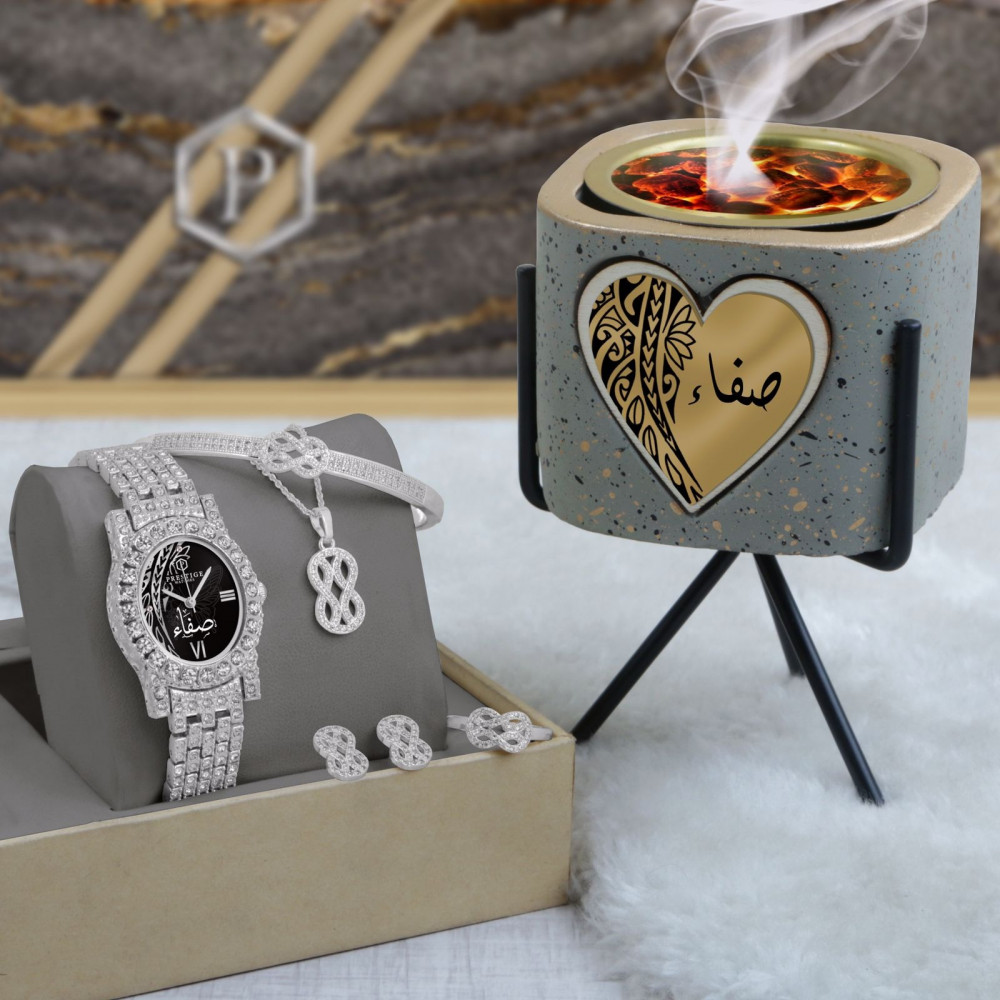 - تصميم راقٍ وشخصي: يتكون الطقم من ساعة فاخرة من الستانلس ستيل المرصع بفصوص الكريستال، على طراز ماركة فان كليف الشهيرة، مع إمكانية نحت الاسم على الساعة والمبخرة. هذا التخصيص يجعلها هدية نسائية مميزة وغير تقليدية.
