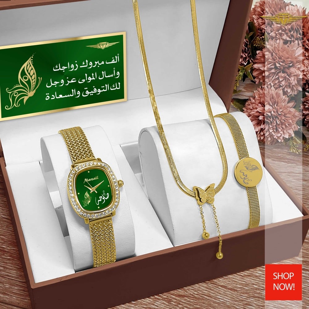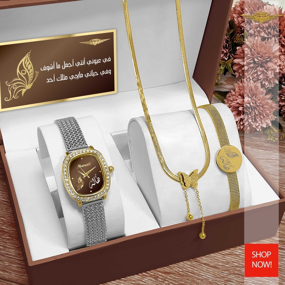 • ساعة نسائية: بتصميم فريد من الستانلس ستيل، مع إمكانية نحت الاسم عليها حسب الطلب.