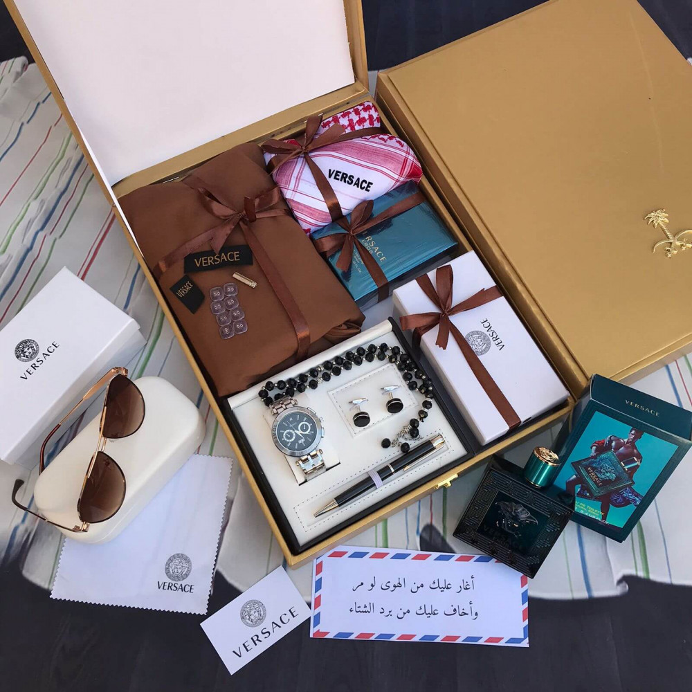 - الطقم يضم سبع قطع أساسية وفاخرة (قماش، شماغ، عطر، نظارة، ساعة، كبك، قلم).