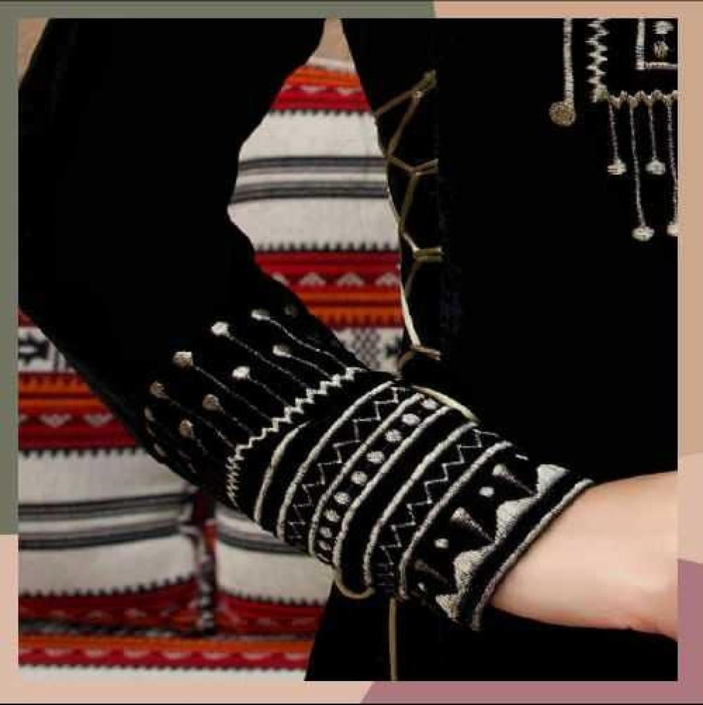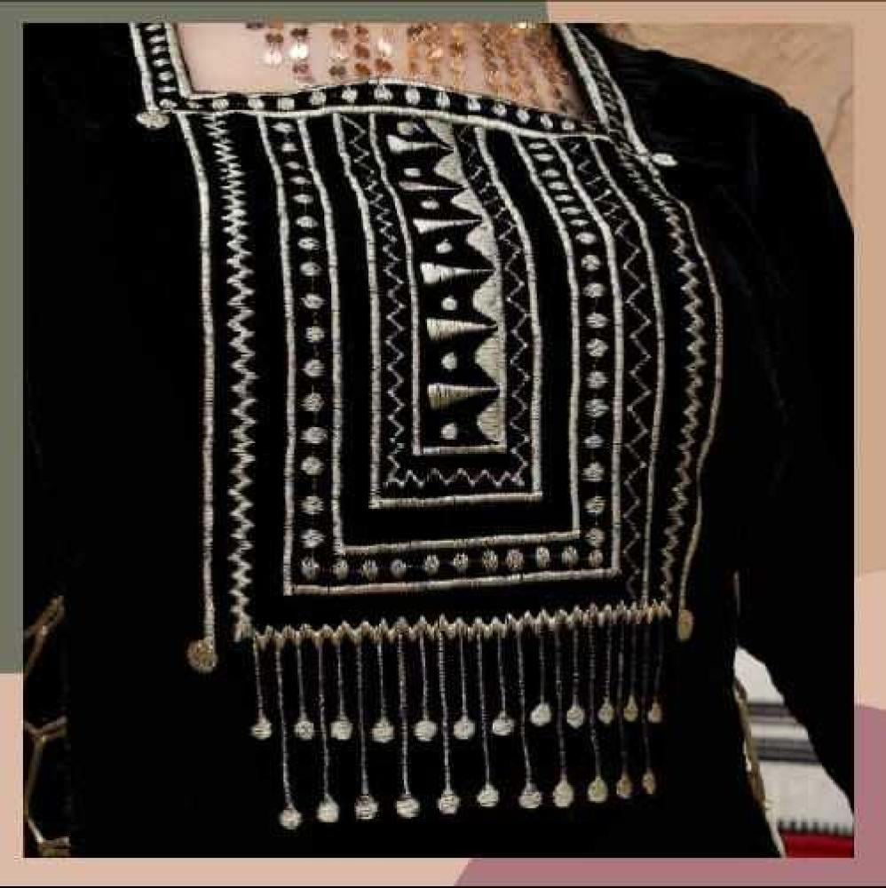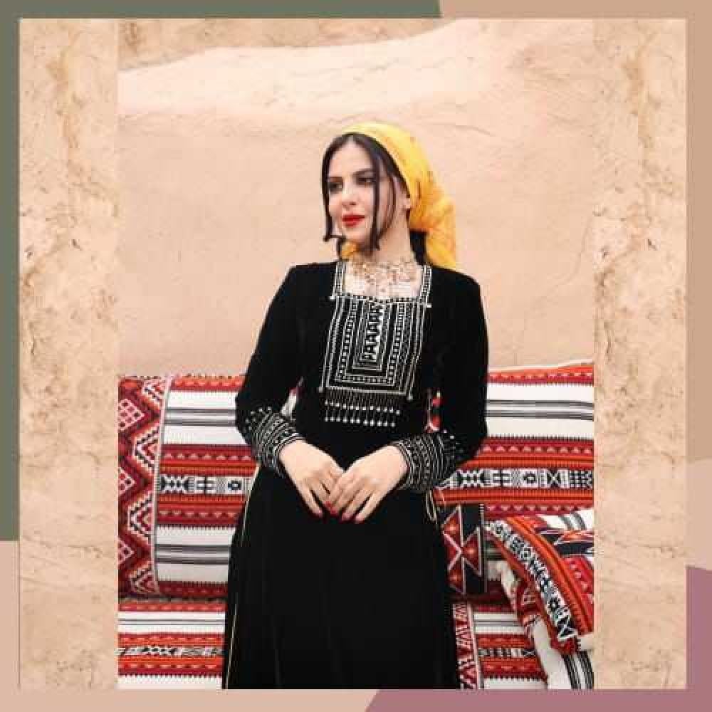 يتميز هذا الفستان الأسود بتفاصيله المتقنة المستوحاة من الزي الجنوبي للنساء، مع تطريز دقيق بالنقش الجنوبي على الصدر واليدين. كما أنه يأتي بتصميم مميز على الخصر على شكل كورسيه بالقيطان الفضي، مما يمنحكِ قوامًا رشيقًا.