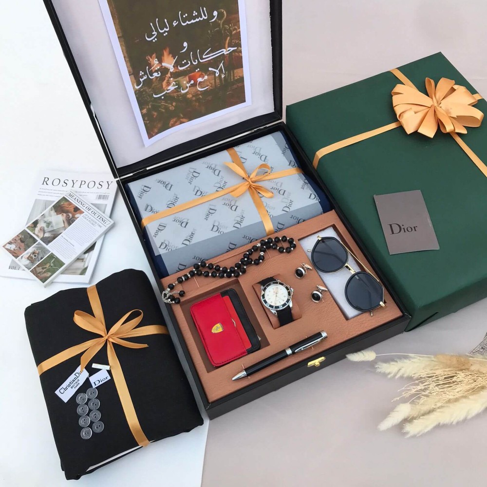 ج: يتميز بجمعه 7 قطع فاخرة من ماركة ديور (قماش، نظارة، ساعة، قلم، كبك، سبحة، بوك)، مما يجعله طقم هدايا شتوية رجالية متكامل.