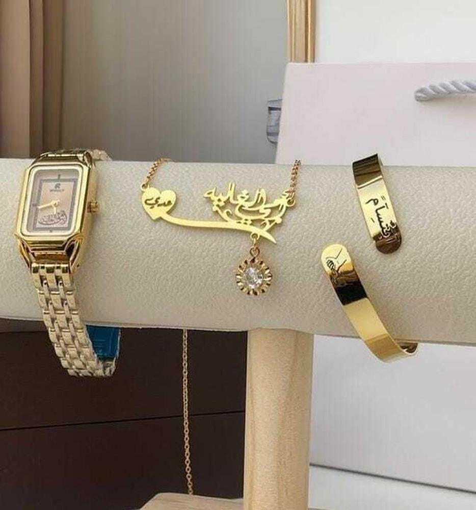 - ساعة بالاسم: ساعة أنيقة من الستانلس ستيل، مضادة للماء ومزينة بالاسم حسب الطلب.